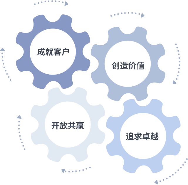成就客户是一切决策的出发点,,,创造价值是衡量所有工作的标准,,,,追求卓越是我们做事做人的态度,,开放共赢是我们的格局也是最终的结果。。。。价值观的齿轮环环相扣,,,推动着组织里的每个人不断向前。。。